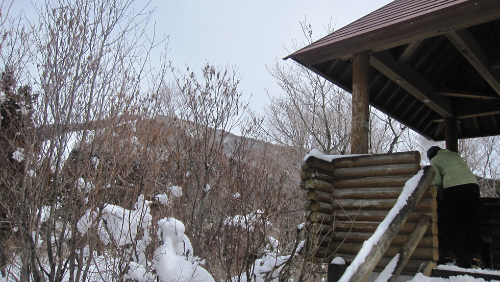 小屋の辺りは4〜50センチ位あったでしょうかか、この先はもうラッセルしか無いし、時間が〜-と言う事で近くの東屋でランチタイム。